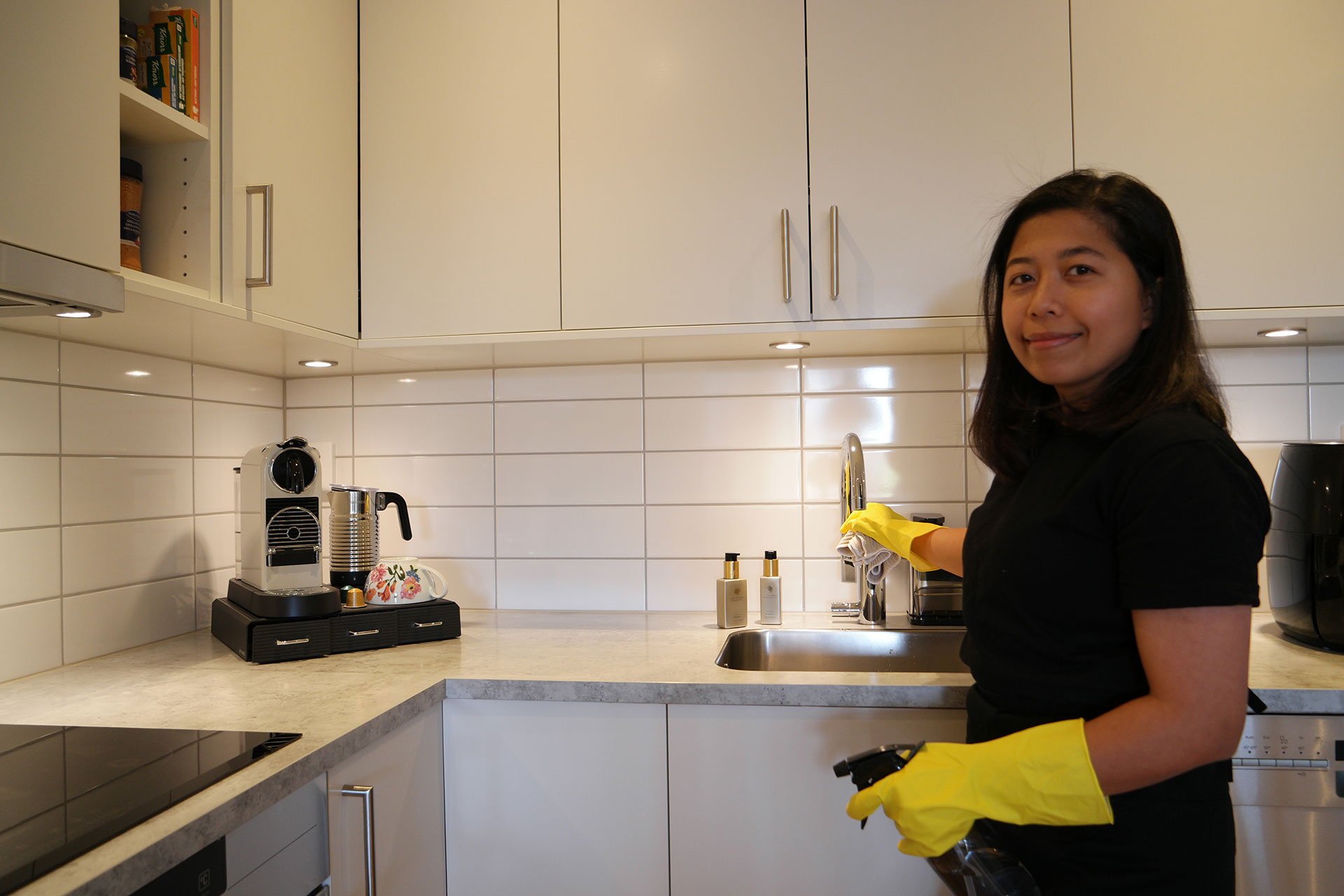 Bänkar och fläckar: Rengöring av köksbänkar och punktstädning av väggplattor.